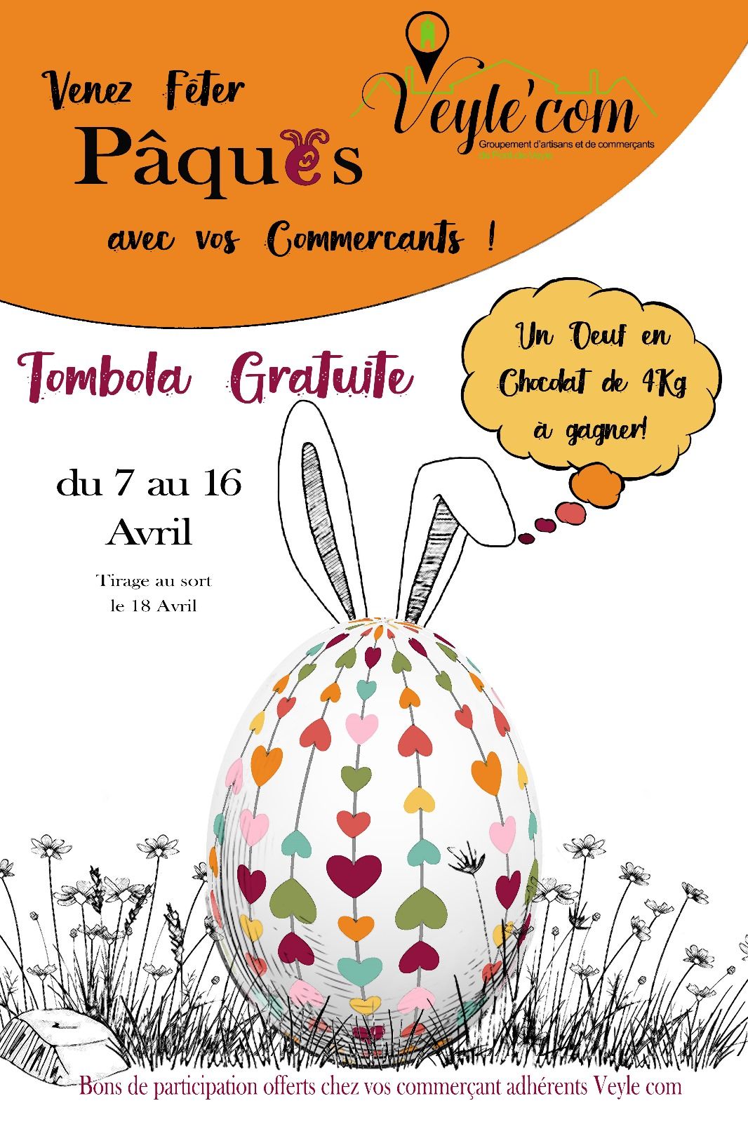 Envie de chocolat ? Vos commerçants locaux ont pensé à vous et vous offrent une chance de remporter un joli cadeau pour Pâques : un œuf en chocolat de 4 kg ! Une initiative gourmande de l’union des commerçants de Pont-de-Veyle qui promet de ravir petits et grands.