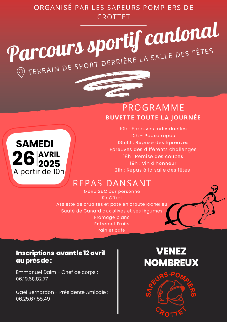 Le village de Crottet accueillera le samedi 26 avril, à partir de 10h, le traditionnel parcours sportif cantonal, organisé par les sapeurs-pompiers de la commune. Cette journée placée sous le signe du sport, de la solidarité et de la convivialité se déroulera sur le terrain de sport situé derrière la salle des fêtes.