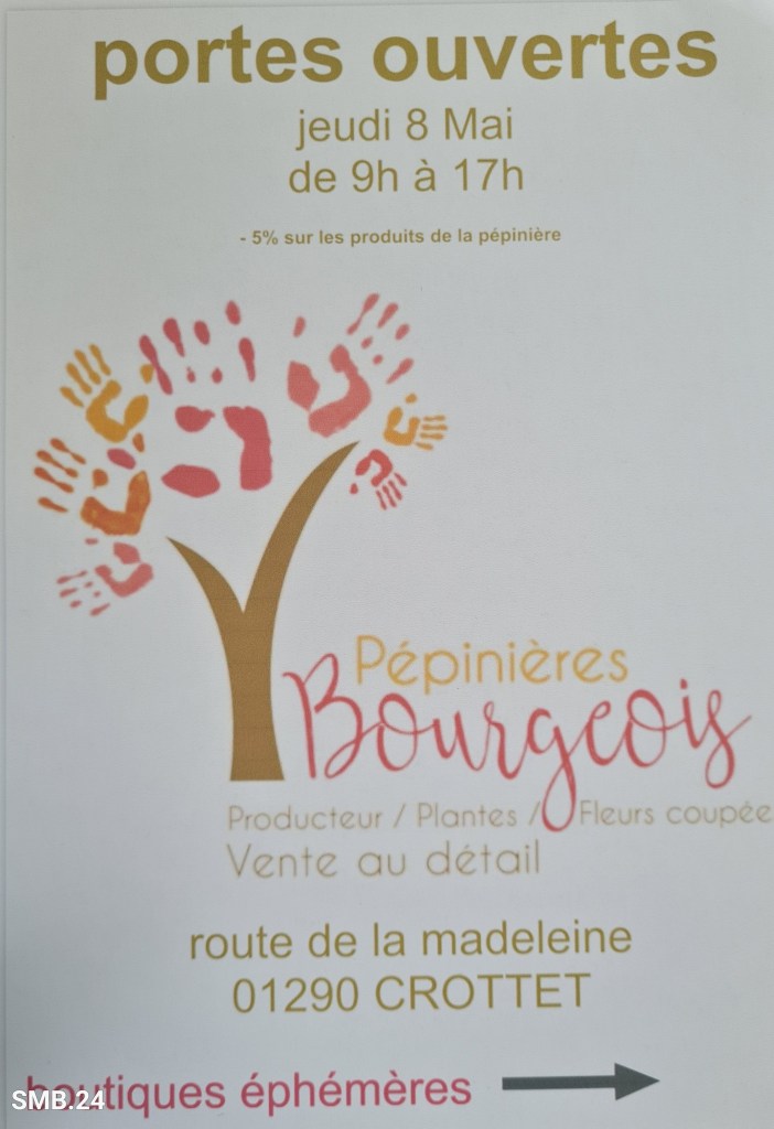 Les Pépinières Bourgeois, situées au 500, route de la Madeleine à Crottet, renouvellent leurs traditionnelles journées portes ouvertes, le jeudi 8 mai, de 9h00 à 17h00. En cette saison des plantations et du jardinage, vous pourrez découvrir une grande variété de produits pour embellir votre jardin et créer un espace verdoyant à la hauteur de vos attentes. Vous trouverez un large choix de plants pour votre potager, vos massifs et jardinières.