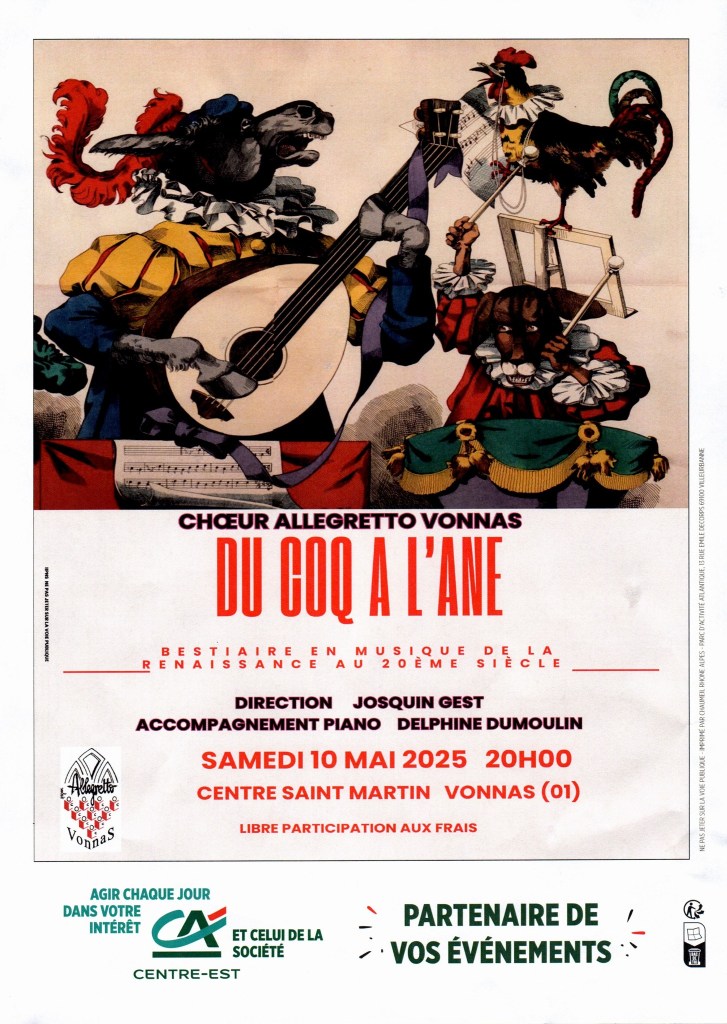 Le chœur Allegretto de Vonnas vous invite à un voyage musical unique le samedi 10 mai, à partir de 20h, au centre Saint-Martin. Intitulé « Du coq à l’âne », ce concert promet une exploration envoûtante du bestiaire musical, de la Renaissance au 20ème siècle.