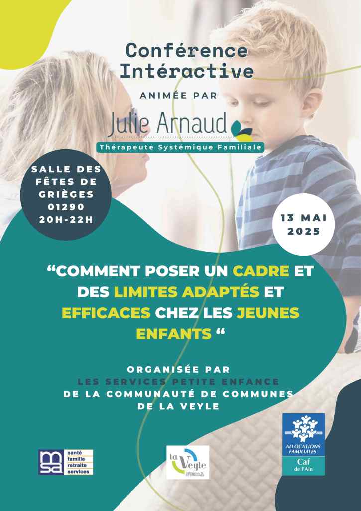 Animée par Julie Arnaud, thérapeute systémique familiale, cette conférence interactive se tiendra mardi 13 mai de 20h à 22h à la salle des fêtes de Grièges. L’événement s’inscrit dans une volonté de soutien à la parentalité et d’accompagnement des pratiques éducatives, dans une période où la recherche de repères clairs et bienveillants devient un enjeu central du développement des jeunes enfants souligne le Vice-Président aux services publics et aux familles, Gilles Rapy.