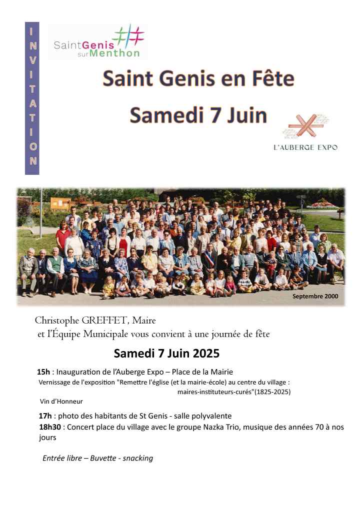 À 17h, les habitants sont invités à participer à une photo collective dans la salle polyvalente, un moment symbolique de rassemblement et de mémoire partagée. Il s’agit de reproduire la photo qui avait été faite en 2000, qui regroupent l’ensemble des habitants de St-Genis.