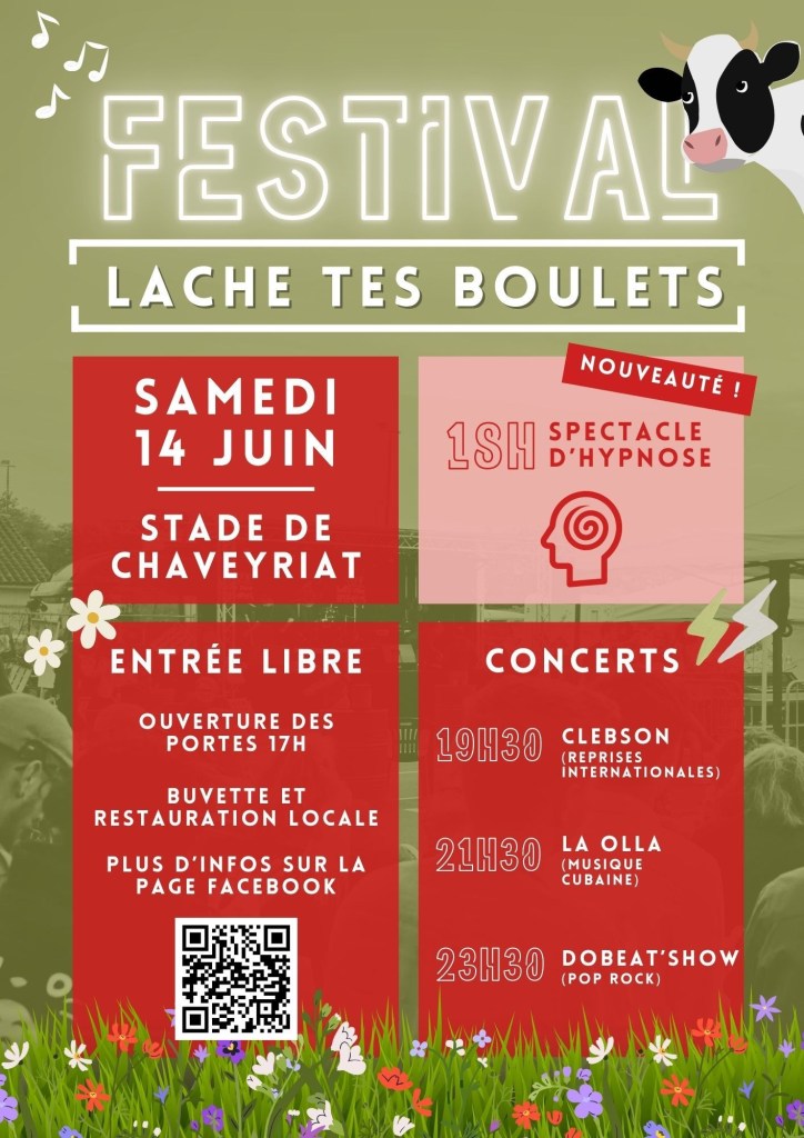 Ce samedi, le festival né dans le hameau des Boulets à Chaveyriat revient animer la commune et le territoire de la Veyle. En musique et en bonne humeur, vous allez profiter d’une nouvelle édition de l’incontournable festival « Lâche tes boulets ». Organisé au stade communal, cet événement familial et festif promet une soirée riche en émotions et en découvertes, le tout en accès libre et gratuit.