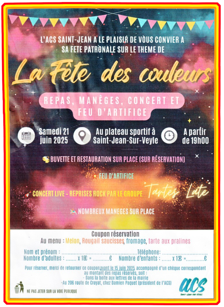 La commune de Saint-Jean-sur-Veyle s’apprête à célébrer sa fête patronale ce samedi 21 juin, avec une série d’événements organisés pour le plaisir de tous. L’association culturelle et sportive locale, organise la « Fête des Couleurs » à cette occasion. Au programme : un repas convivial, des manèges, un concert et un feu d’artifice pour clore la soirée en beauté.