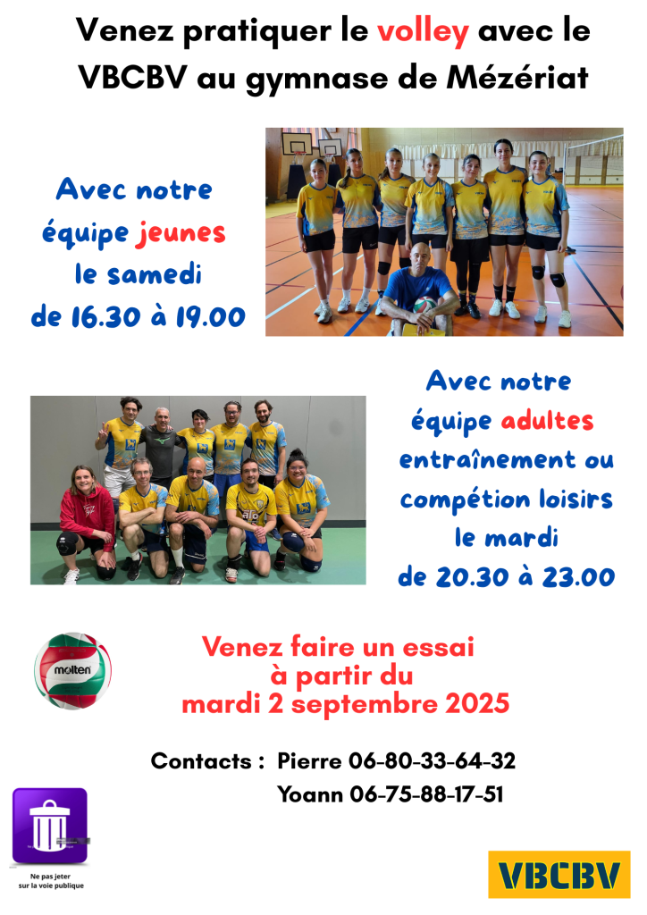 En ce jour de rentrée, le club de volley-ball de la communauté des bords de Veyle (VBCBV) ouvre ses portes à tous les passionnés, débutants ou confirmés, au gymnase de Mézériat.