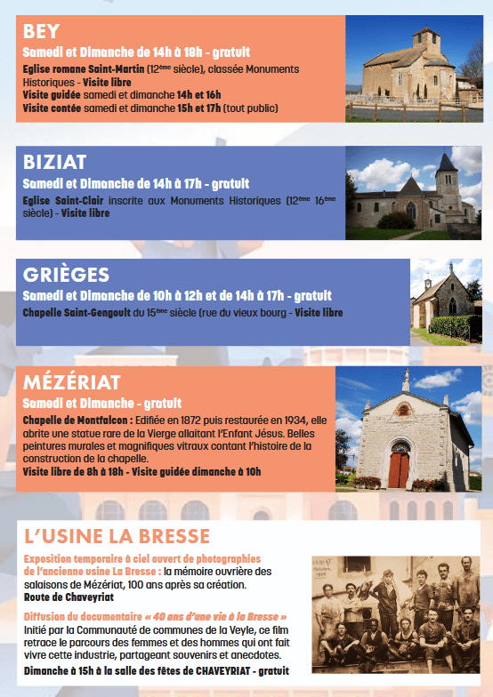 À Saint-Jean-sur-Veyle, l’église gothique et le Moulin Grand offriront des visites guidées pour plonger dans l’histoire religieuse et artisanale de la commune.