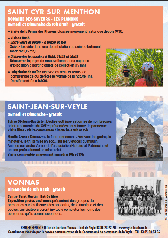 Portées par les associations, les bénévoles et les communes, ces Journées du Patrimoine sont l’occasion de célébrer l’histoire locale et découvrir la richesse des villages de la Veyle.