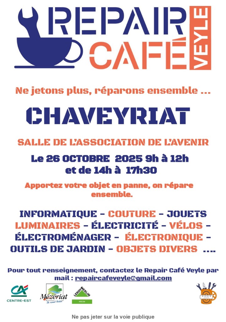 Repair Café Veyle lance une journée d’ateliers dédiés à la réparation de vos objets cassés. La permanence aura lieu à la salle de l’association de l’avenir à Chaveyriat, ce dimanche de 9h à 12h et de 14h à 17h30.