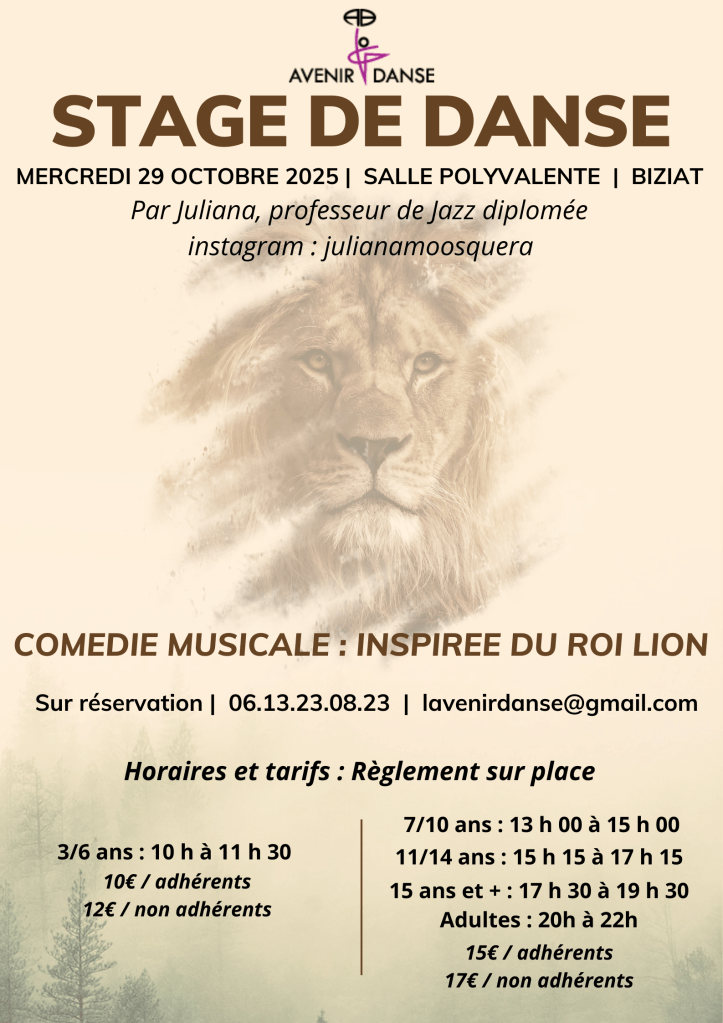 L’association Avenir Danse organise un stage de danse, le mercredi 29 octobre 2025, à la salle polyvalente de Biziat. Juliana, professeure diplômée de modern Jazz, assurera cette journée qui aura pour thème la version comédie musicale du Roi Lion.
