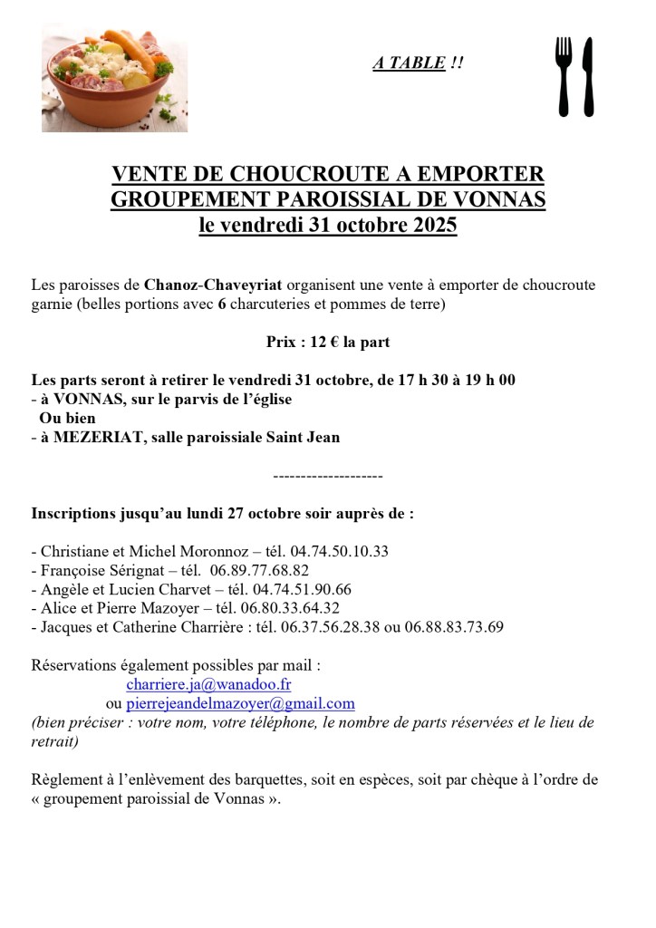 Le groupement paroissial de Vonnas organise une vente de choucroute garnie à emporter. La part se compose de 6 charcuteries différentes, de choucroute et de pommes de terre, au tarif de 12€ la part.