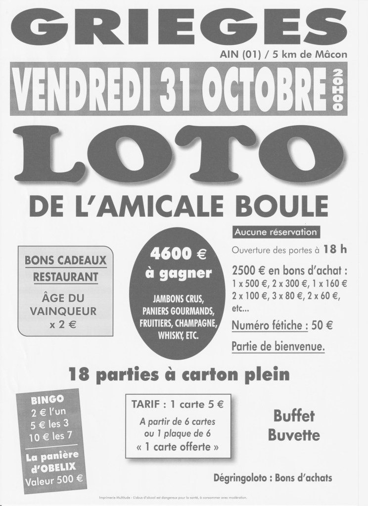 L’Amicale Boules de Grièges organise son loto annuel, le vendredi 31 octobre 2025, à 20h, à la salle polyvalente de Grièges.
