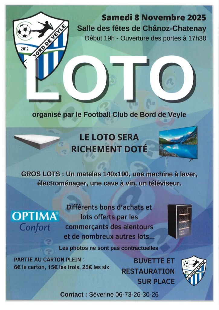 Le Football Club de Bord de Veyle organise un loto avec de nombreux lots à gagner tels qu’un téléviseur, une cave à vin, un matelas 140×190, une machine à laver, et de l’électroménager. Les cartons sont disponibles à 6 € l’unité, 15 € les trois ou 25 € les six.