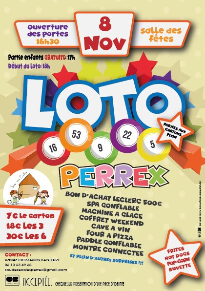 Le Sou des écoles de Perrex organise un loto avec un bon d’achat Leclerc à gagner de 500 €, ainsi que de nombreux autres bons d’achat dans divers magasins et restaurants. Les cartons sont proposés à 7 € l’unité, 18 € les trois ou 30 € les six.