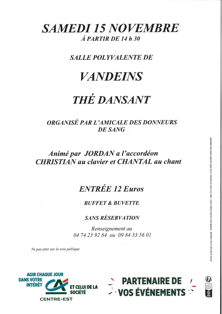 Venez participer au Thé dansant organisé par l’Amicale des Donneurs de Sang Bénévoles des communes de Chaveyriat, Mézériat et Vandeins , pour soutenir l’association !