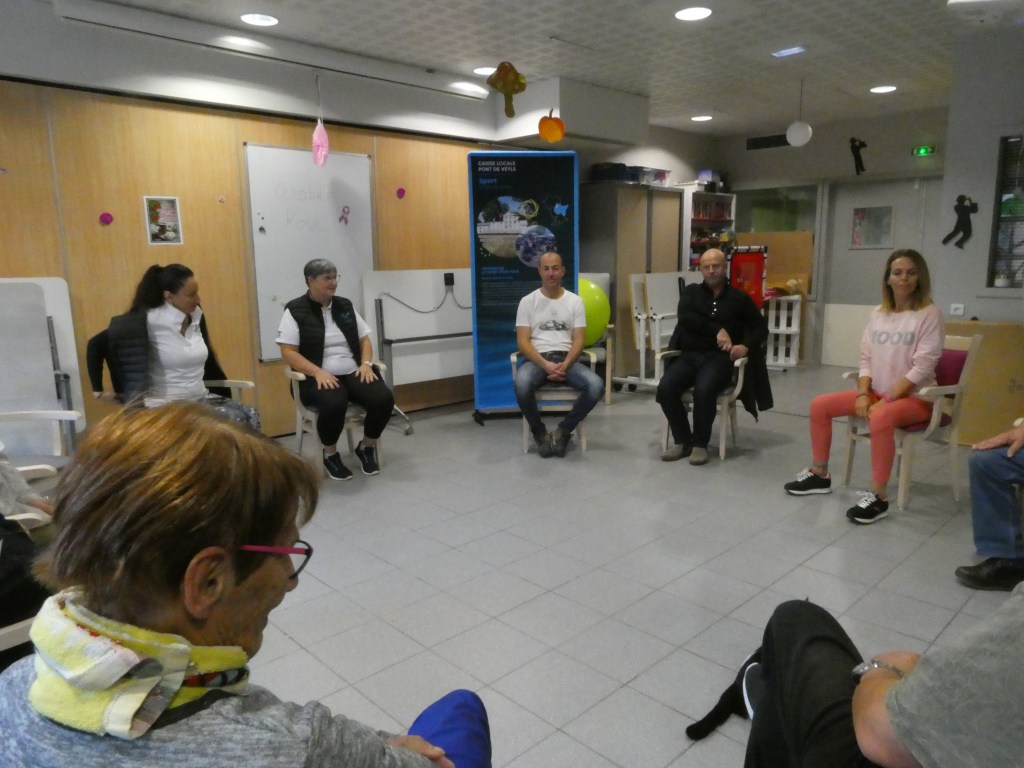 Nous sommes le mercredi 5 novembre, il s’agit de la 5ème séance du programme et ce jour-là trois binômes « aidant-aidé » sont présents pour suivre cette séance de yoga sur chaise, ainsi que les administrateurs de la Caisse Locale, venus vivre avec eux cette expérience. Tout le monde est assis sur une chaise et en cercle, on écoute attentivement Carole Courtois, professeure de yoga, qui intervient dans plusieurs EPHAD et unités protégées Alzheimer dans la région. Elle explique comment va se dérouler la séance : tous les mouvements sont adaptables à la situation et aux possibilités de chacun, peu importe l’amplitude, ce qui compte c’est d’accorder sa respiration aux mouvements du corps, et pour cela elle guide chaque consigne par « j’inspire » ou « j’expire ». La séance se déroule dans une atmosphère sereine et détendue, bientôt les bâillements ou même les petits fous-rires montrent que les tensions se relâchent. Même si l’on est assis sur une chaise, tout le corps peut se mettre en mouvement. Un temps d’intériorisation termine la séance.