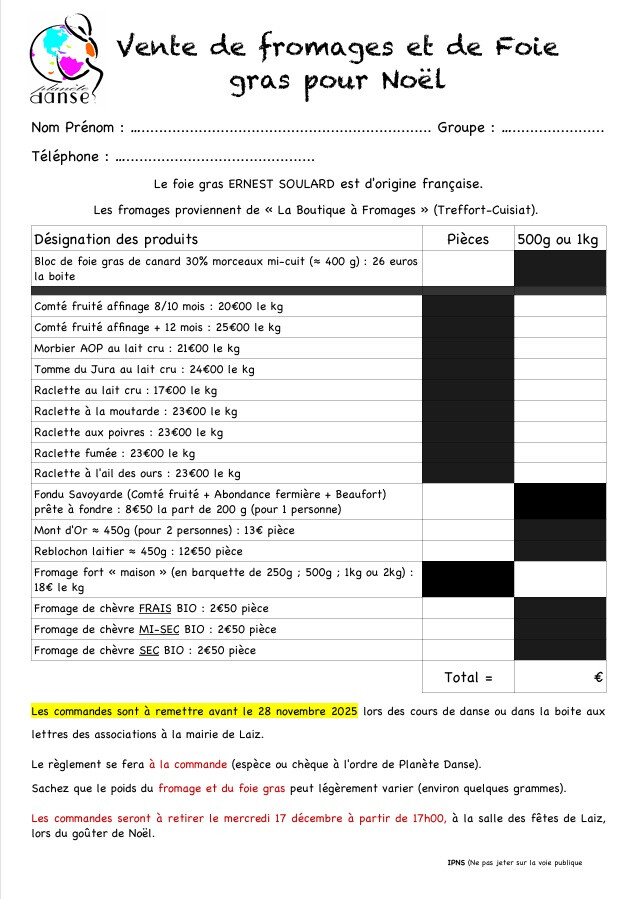 A vos bons de commande : les réservations se font avant le vendredi 28 novembre 2025. Remplissez le coupon et déposez-le dans la boîte aux lettres des associations à la mairie de Laiz, accompagné du règlement par espèce ou chèque à l’ordre de Planète Danse.
