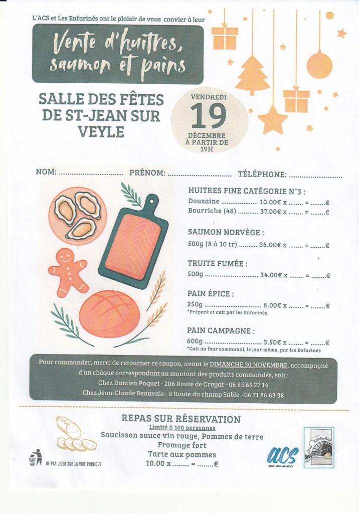 Cette année encore, l‘Association Culturelle et Sportive de Saint-Jean-sur-Veyle et les Enfarinés s’associent pour vous proposer une soirée de vente de produits de fêtes. Grâce aux produits qu’ils proposent, vous pourrez préparer de délicieux toasts au saumon ou à la truite et des plateaux d’huîtres.