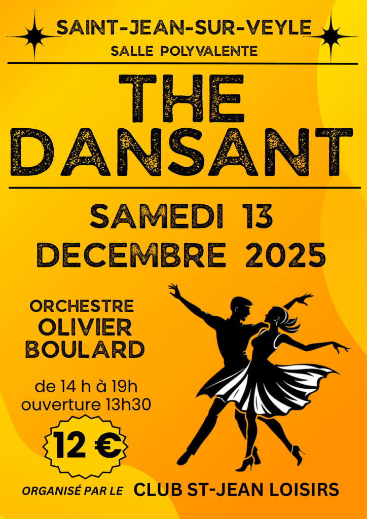 Le samedi 13 décembre 2025, retrouvez-vous lors du traditionnel thé dansant organisé par le Club Saint-Jean Loisirs, à la salle polyvalente de Saint-Jean-sur-Veyle. Rendez-vous de 14h à 19h sur la piste de danse pour partager un moment convivial sur les rythmes du musicien Olivier Boulard !
