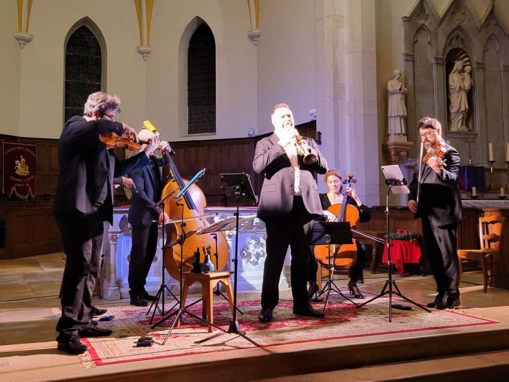 Vendredi 19 décembre, ce sont près de 230 spectateurs qui se sont fait envoûter par la « Nuit Fantastique » de Romain Leleu Sextet. Devant la salle comble, l’ensemble composé d’un quintette à cordes et d’une trompette a interprété des titres issus du répertoire classique, mais aussi cinématographique, à l’instar des compositeurs Bernstein et Morricone. Le public a également eu la belle surprise de découvrir des reprises de musiques de Noël. Il faut dire que ce 19 décembre, l’ambiance s’y prêtait particulièrement : sous des lumières tamisées, dans le cadre enchanteur de l’église de Grièges, c’est un véritable cadeau de Noël en avance que le Romain Leleu Sextet a offert au public, qui, en retour, lui a fait une standing ovation. L’alchimie fut parfaite, et nul doute que tous sont sortis conquis de cette soirée. Ce fut également un moment empreint d’émotion pour le trompettiste et fondateur de la formation, Romain Leleu, qui se produisait pour la première fois sur le territoire de la Veyle, où il réside.