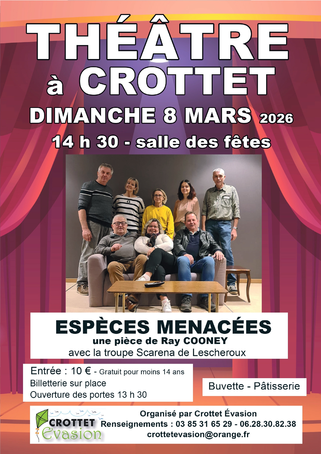 Le dimanche 8 mars, à 14h30, la salle des fêtes de Crottet accueille la troupe Scarena, qui jouera Espèces menacées, du dramaturge britannique Ray Cooney.